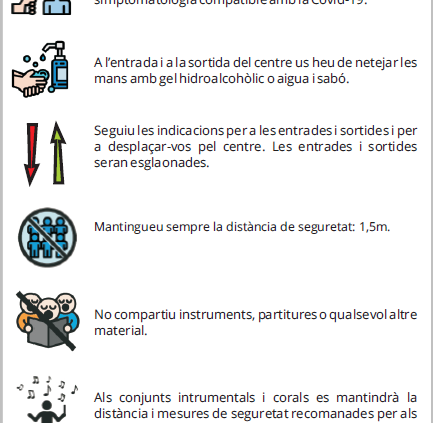 Un díptic (que podeu descarregar en aquesta pàgina) recull de forma visual les principals mesures d´higiene i seguretat, com són l´ús obligatori de la mascareta i el rentat de mans, la presa de la temperatura, les entrades i sortides al centre esglaonades, no compartir instruments i material, entre altres. També us podeu descarregar un pdf on està trobareu detallat el pla organitzatiu del centre.