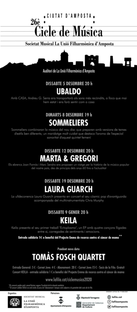 Les restriccions decretades el passat mes d’octubre van portar a l’ajornament dels concerts. La nova programació arrencarà al Pont de la Puríssima, així, el dissabte 5 de desembre tindrà lloc el concert d’Ubaldo i el dimarts 8 de desembre serà el torn de Sommeliers