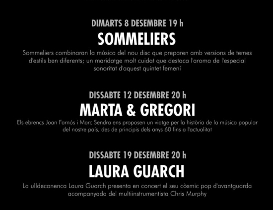 La programació del desembre acabarà amb la ulldeconenca Laura Guarch. Serà el dia 19 a les 20 hores amb la presentació del seu disc Nàufrags, produït braç a braç amb el multiinstrumentista, compositor i productor Chris Murphy a Londres. En el disc, sons de sintetitzador i percussió electrònica conviuen amb instruments acústics de gran dinamisme i expressivitat.