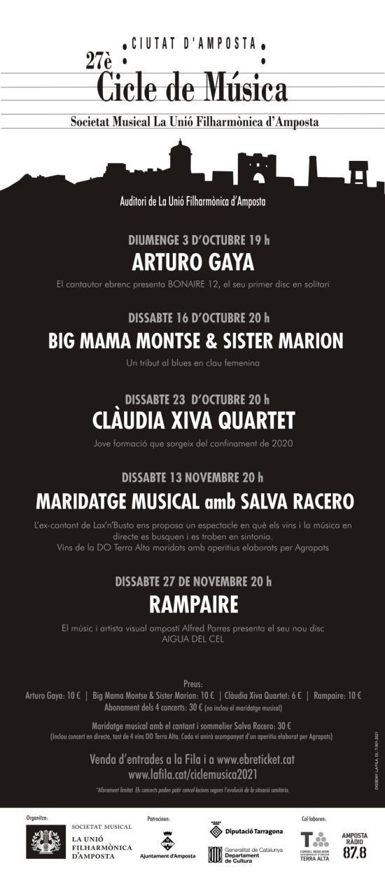 Aquesta setmana, la Societat Musical La Unió Filharmònica d’Amposta hem presentat la programació del Cicle de Música Ciutat d’Amposta. Amb aquesta edició, seran 27 anys oferint una variada programació de concerts i espectacles a la capital del Montsià. A causa de la pandèmia de la Covid, els concerts de la passada edició es van haver de reprogramar diverses vegades, així i tot i, amb el nostre convenciment que la cultura és segura i aplicant totes les mesures de seguretat i higiene, els concerts es van poder dur a terme, un fet que el públic va agrair, per les moltes ganes d’escoltar música en directe després d’un llarg confinament.