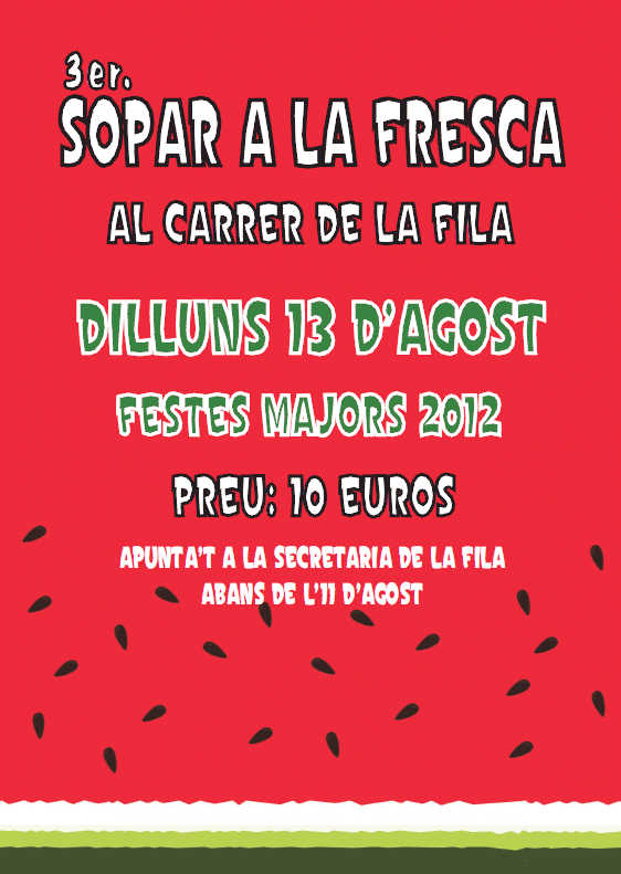 Apunta´t al sopar a la fresca que hem organitzat per al dilluns 13 d´agost a la Fila. El preu és de 10 euros.