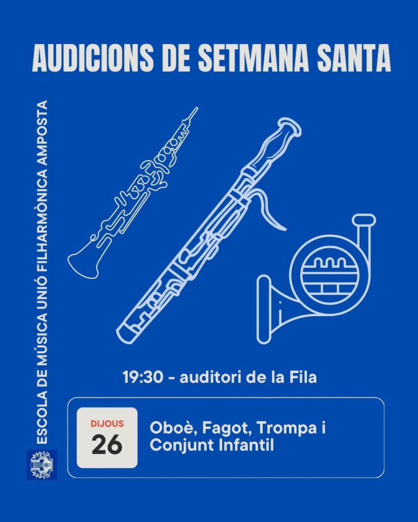 Avui Dijous 26 de Març a les 19.30h us esperem a l’auditori de la Fila per a escoltar i disfrutar de les audicions de Oboè, Fagot, Trompa i Conjunt Infantil.