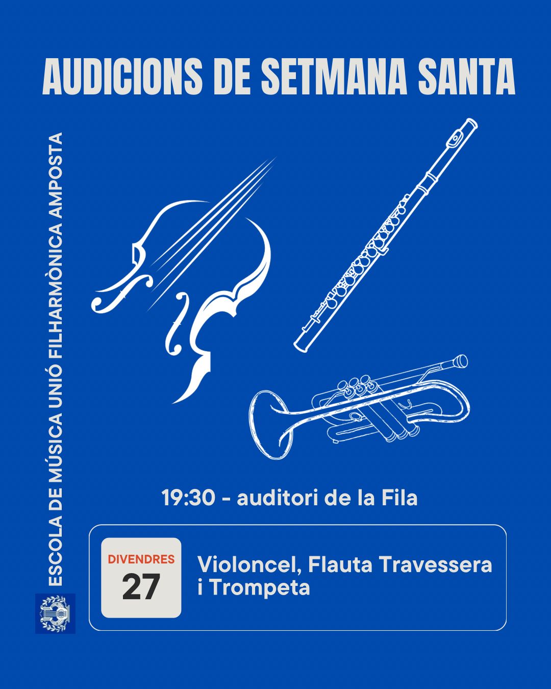 Avui divendres 27 de Març a partir de les 19:30h vine al Auditori de La Fila, per compartir i disfrutar , de la última audició de setmana santa que ens ofereixen els nostres alumnes de: