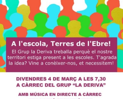 El Grup la Deriva presenta aquest divendres 4 de març a les 19.30 h a la sala d´adults de la Biblioteca Sebastià Juan Arbó el projecte pedagògic «A l´escola, Terres de l´Ebre!». Hi haurà una petita actuació musical a càrrec d´alumnes…