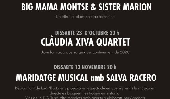 El mes de novembre ens portarà una novetat al Cicle de Música, el Maridatge Musical, un espectacle en què els vins i la música en directe es busquen i es troben en sintonia, on l’espectador és transportat a un món de sensacions, emocions i records que no només es perceben a l’oïda o al paladar, sinó a una perfecta fusió de tots dos alhora. Així, el dissabte 13 de novembre, Salva Racero, excantant de Lax’n’Busto, actor i sommelier, ens guiarà per aquesta experiència sensitiva, amb la seva música i vins de la DO Terra Alta. El tast dels 4 vins anirà maridat amb un aperitiu elaborat per Agrapats.