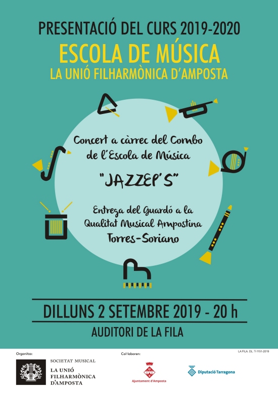 El dilluns 2 de setembre presentem el nou curs escolar 2019-2020. Complementarà l´acte el concert del combo de l´escola Jazzep´s i l´entrega del Guardó a la Qualitat Musical Ampostina Torres-Soriano.
