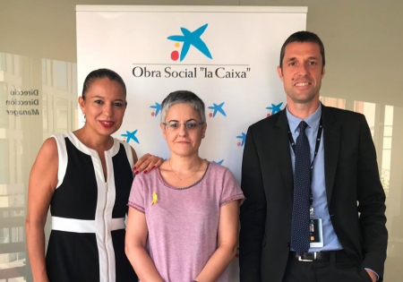 Jordi Gasparin i Anna Barberà de l´Oficina Store de CaixaBank a Amposta i la presidenta de la Fila, Núria Gómez, han formalitzat aquest matí l´acord de col·laboració.