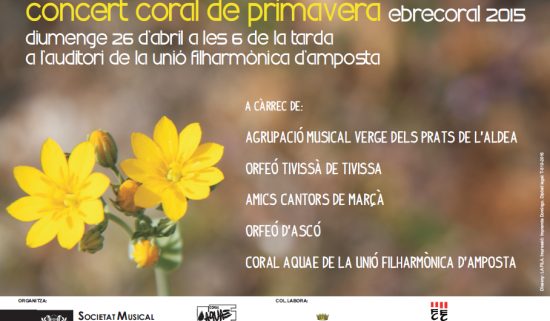 I acabant el mes d’abril, el diumenge, 26 d’abril, va ser el torn de la Coral Aquae de la Unió Filharmònica d’Amposta que com amfitriona del cicle de concerts Ebre Coral 2015 i que va fer coincidir amb el seu tradicional Concert de Primavera, va acollir a quatre corals arribades de diferents comarques: Baix Ebre (Cor de l’Agrupació Musical Verge dels Prats de l’Aldea), Priorat (Coral Amics Cantors de Marçà) i Ribera d’Ebre (Orfeó Tivissa i Orfeó d’Ascó).