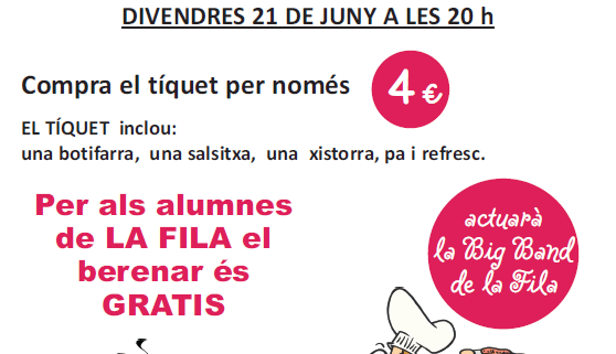 21.00h Gran berenar-sopar organitzat per l’APIMA de l’Escola de Música. (venda anticipada de tíquets a secretaria.) “Amenitzarà la Big-Band de la Fila”